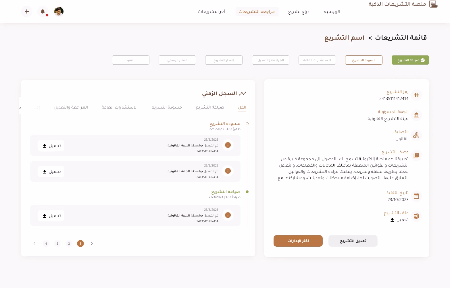 A comprehensive overview page displays key metadata for each legislation, including title, reference number, responsible committee, and status. Users can quickly locate and monitor ongoing legislation in one centralized interface designed for clarity and accessibility